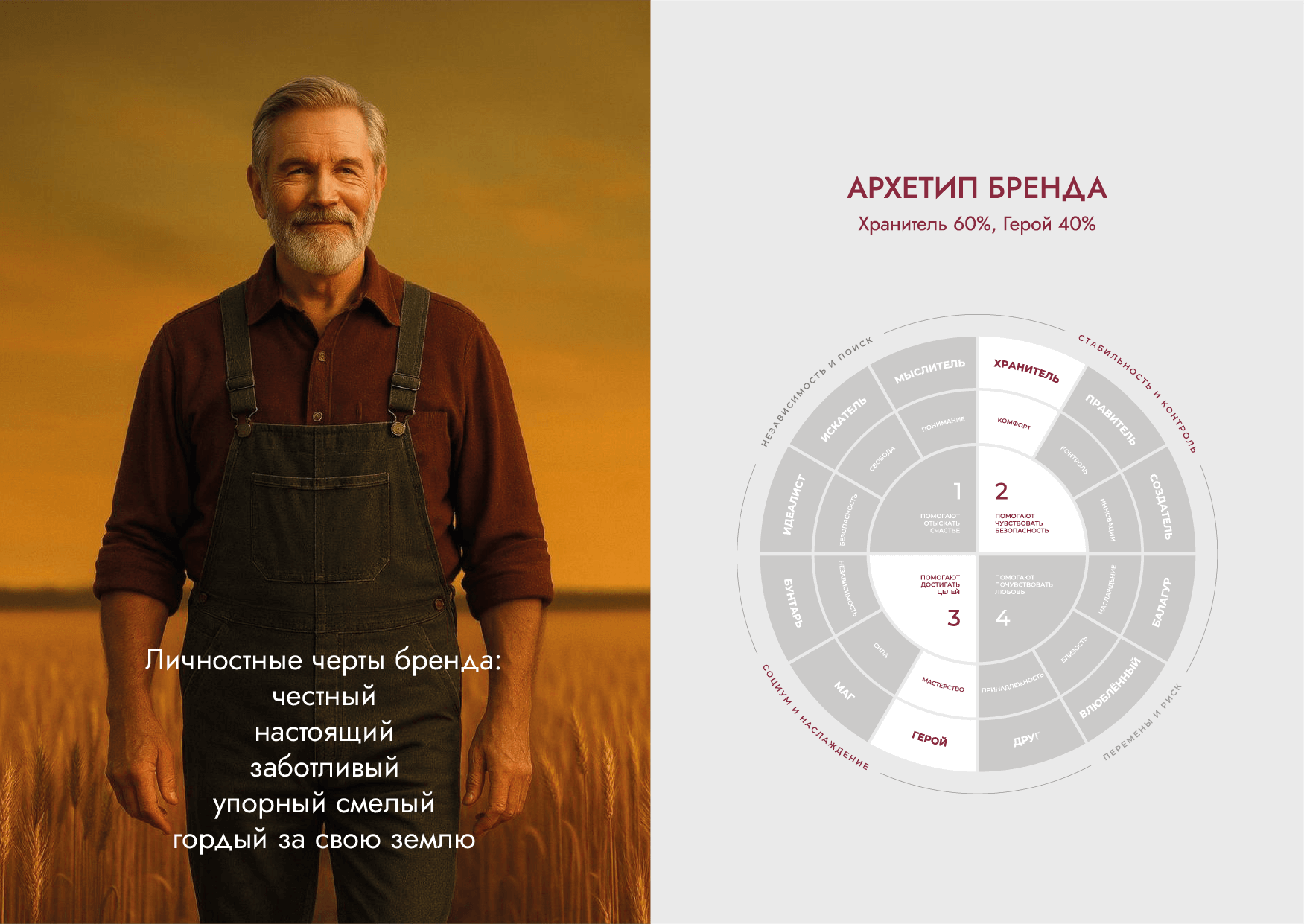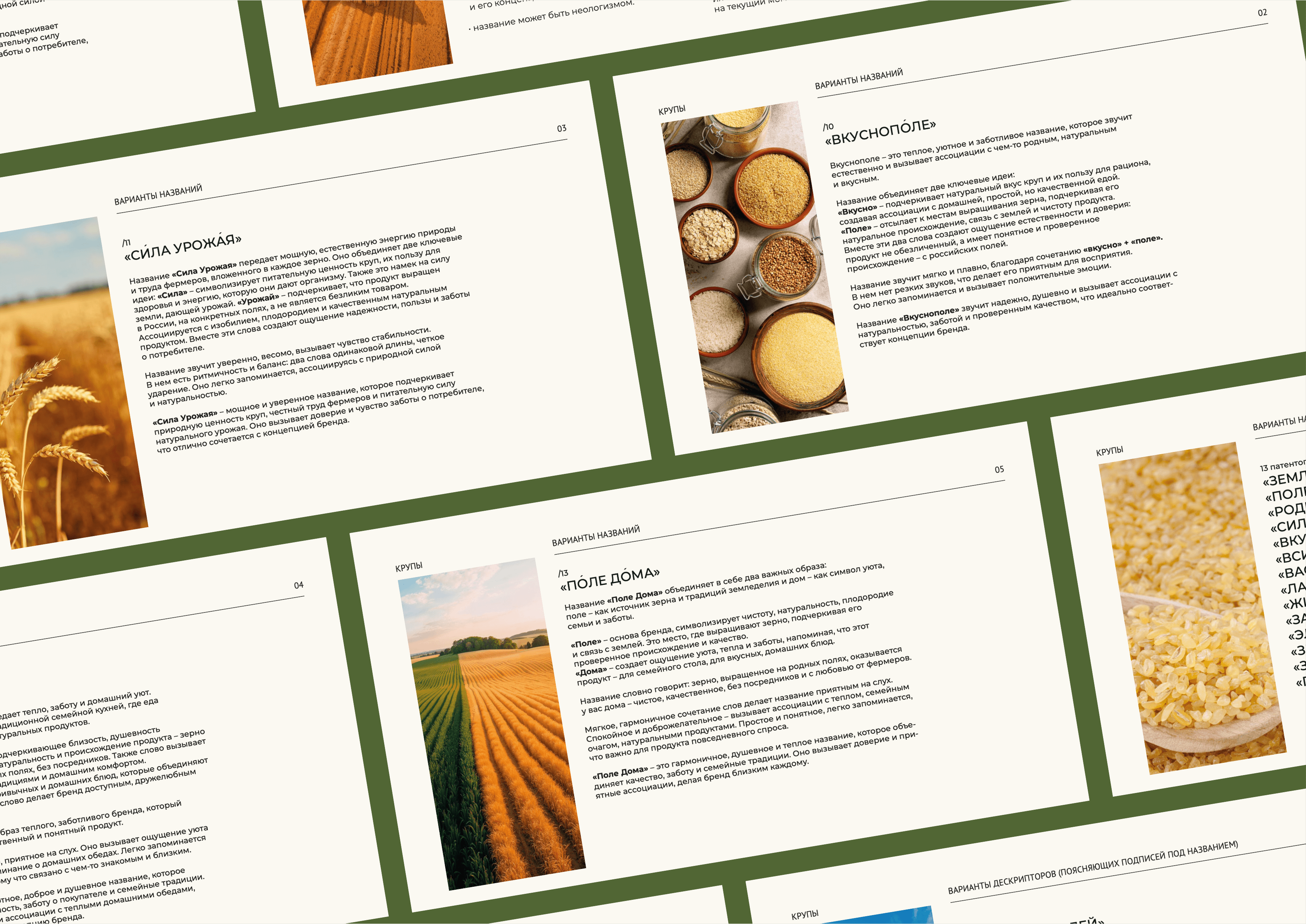 Мы искали имя, которое передаёт заботу о человеке, уважение к земле, честный труд фермеров и натуральность продукта. Ключевые ассоциации: поле, зерно, солнце, урожай, честность, вкус.
